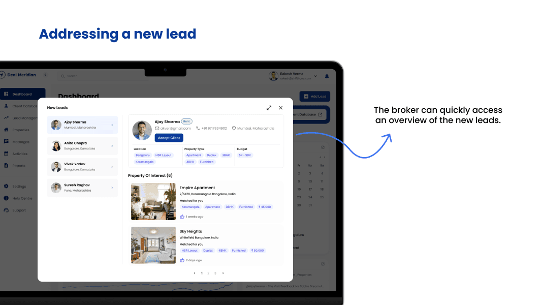 Brainstorming & Ideation: Conducted Crazy 8s sessions to generate concepts for dashboards, client management, and lead tracking.
