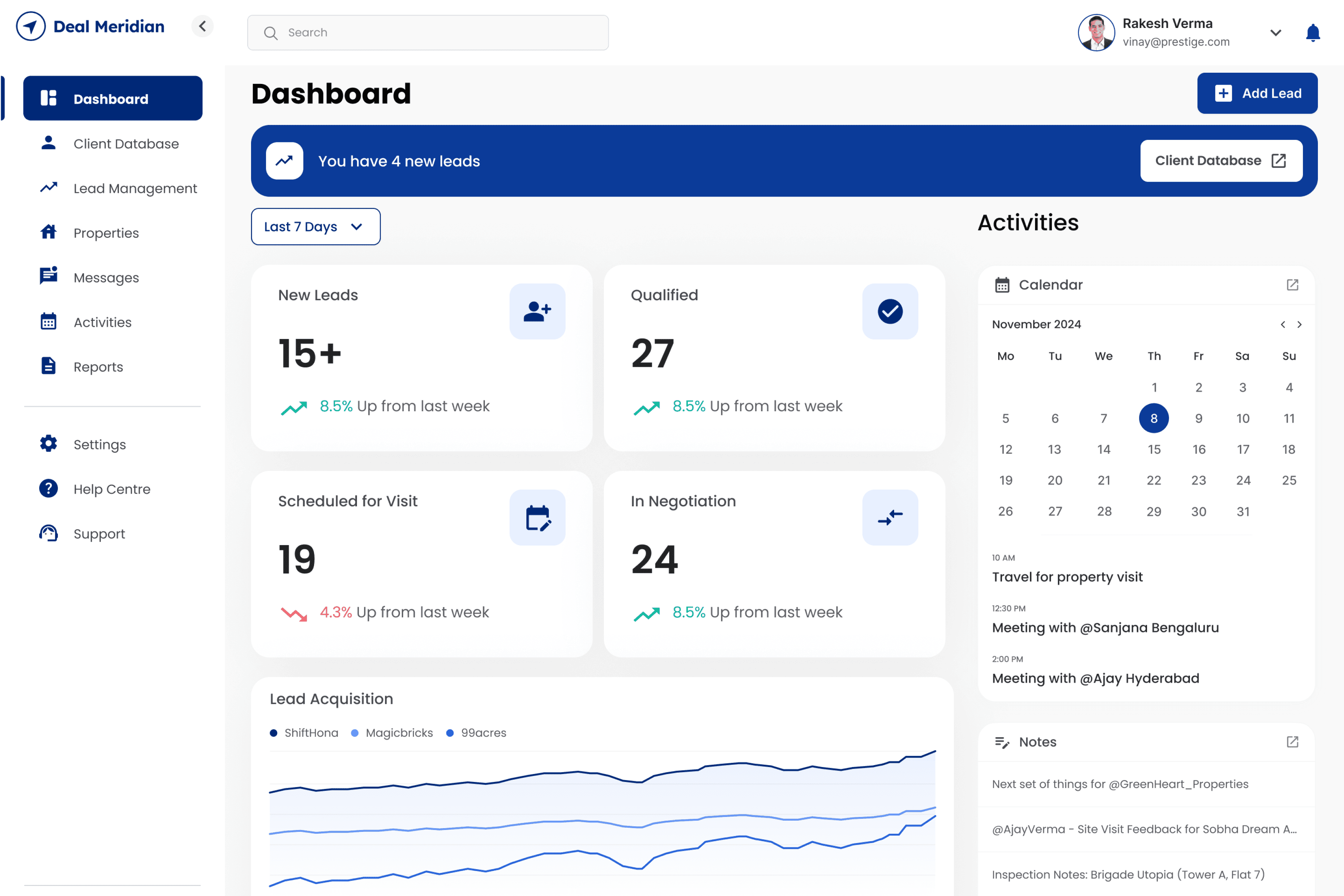 As part of my Master’s program, I worked on an industry-sponsored project with Deal Meridian, a New York based Property Tech company building AI-powered relationship management tools. The project began with a simple observation that across Indian cities, property brokers were running their entire businesses across WhatsApp threads, Excel sheets, listing portals, phone calls, and handwritten notes. Every broker had their own way of keeping track of clients. None of it lived in one place.